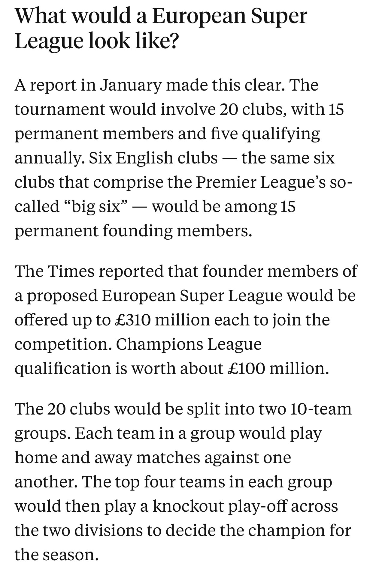Egyebkent ez a 2024-es BL formatum 36 csapatos lenne (ebbol 2 extra hely jarna azoknak a csapatoknak, akiknek a legmagasabb a coefficiensuk, de a bajnoksagukban lemaradtak a BL helyekrol. ez iden siman lehet a juve meg a pool). Mindegyik csapat 10 meccset jatszana es lenne egy kozos bajnoki tabella. (gondolom sorsolasnal itt is lennenek kalapok meg ilyesmi). Az elso 8 helyezett automatikusan tovabbjutna, a kovetkezo 16 elobb jatszana egy oda-visszavagos selejtezot, majd a 8 gyoztes es a korabbi 8 automatikusan tovabbjutoval folytatodna a BL a megszokottak szerint.