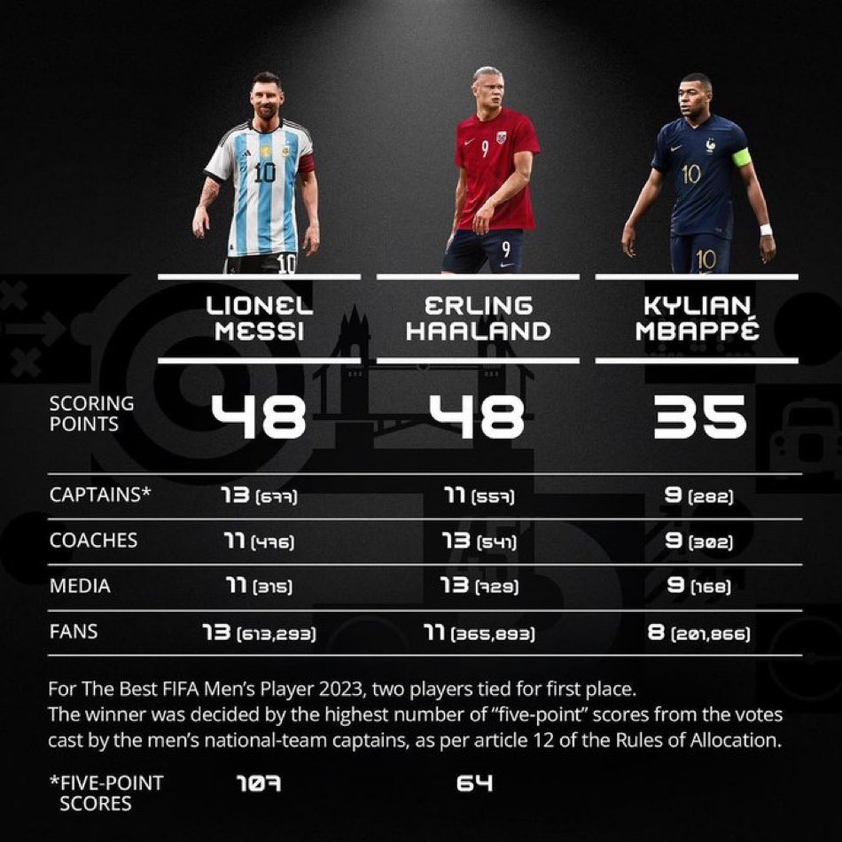 Holtverseny volt amúgy, 48-48 pontjuk van Haalanddal, azért nyert Messi mert rá 13 kapitány szavazott, a norvégra csak 11.