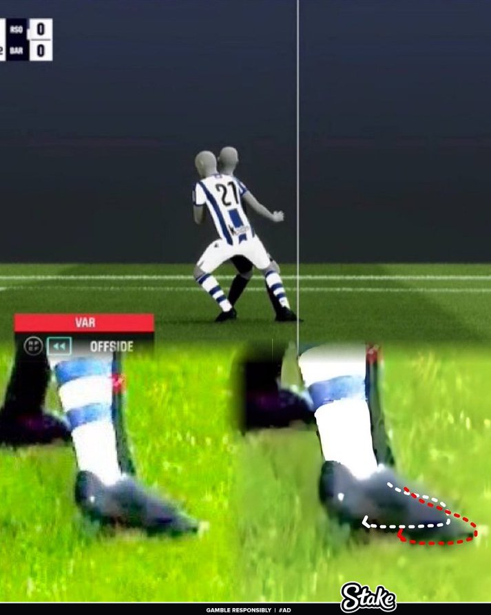Itt egy TVs kép meg egy VAR kép összemosása, tisztán látszik, hogy a VAR egy későbbi kockát nézett, ahol előremozdult már a lábfeje, Lewa sarkából látszik.
